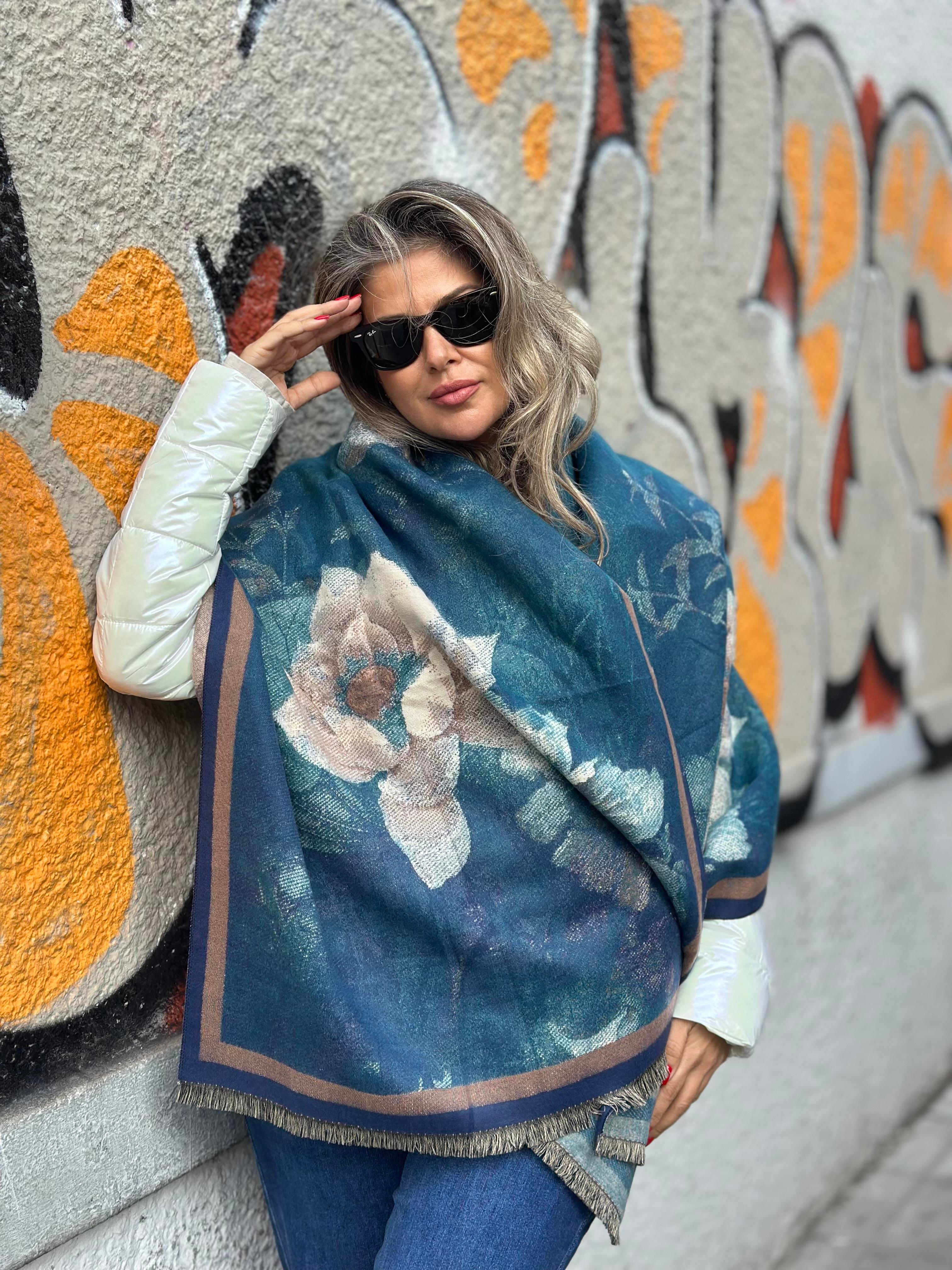 Çiçek Desenli Mavi Şal